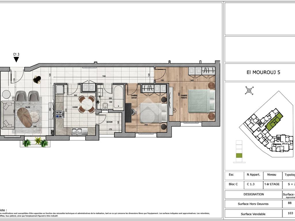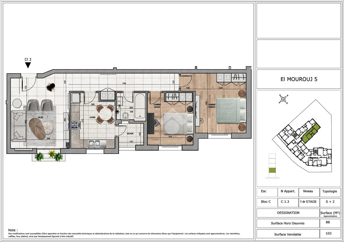 Découvrez nos appartements S+2 sur plan, idéalement situés à Mourouj 5, à deux pas de toutes les commodités : commerces, écoles et transports.
